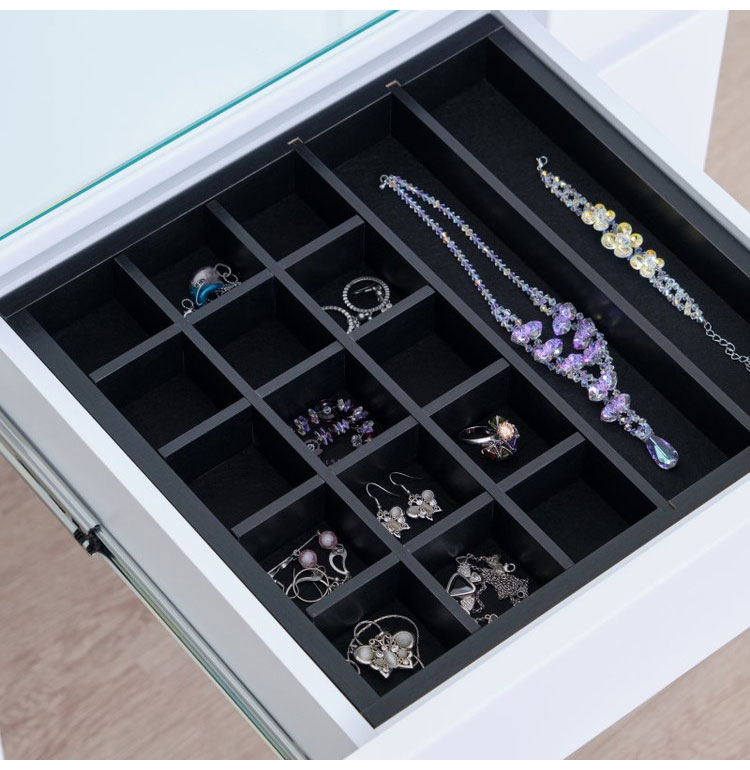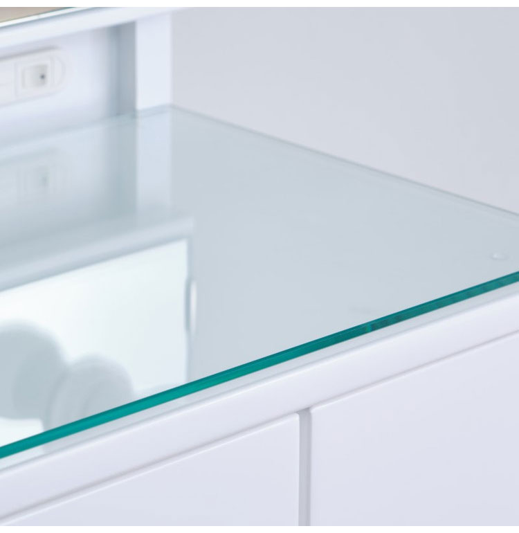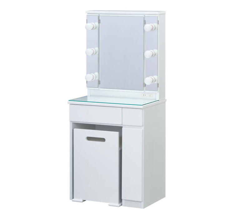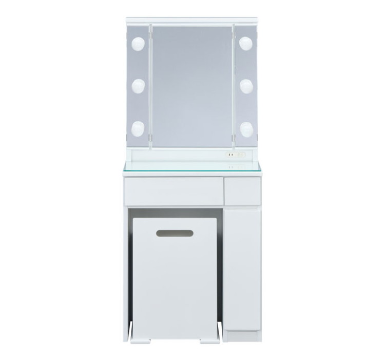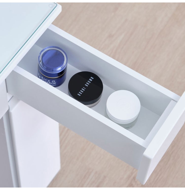 LEDライトは非常に明るく、仕分けのある引き出しや鏡裏、スツール内の収納などドレッサーを使う方が喜ぶ機能が盛りだくさんのドレッサーです。