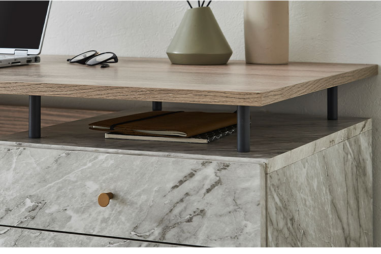 リアルな質感のメラミン柄とゴージャスな石目柄を組み合わせたモダンスタイルの片袖デスク。