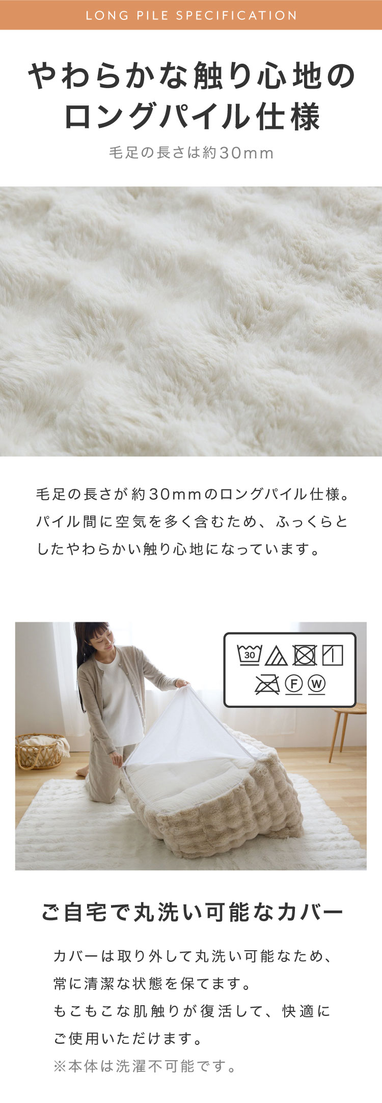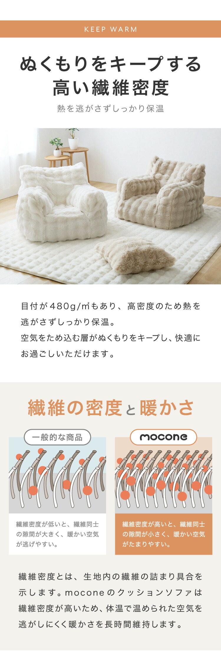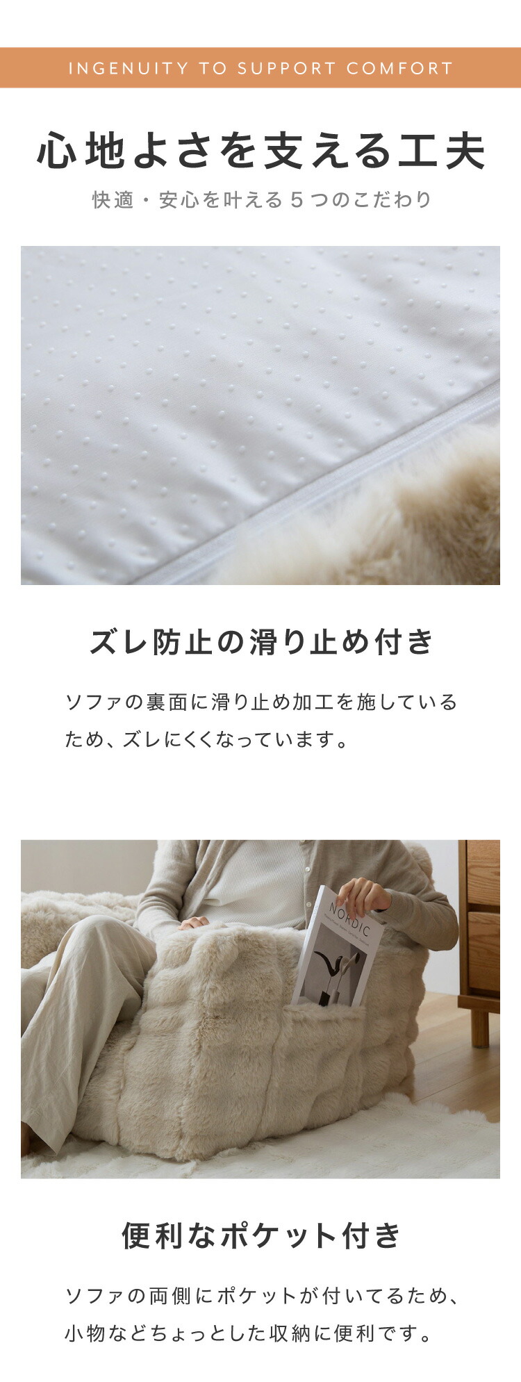 カバー上部には、もこもこ質感が心地よいポコポコラビット生地(480g/平方メートル)を使用。
