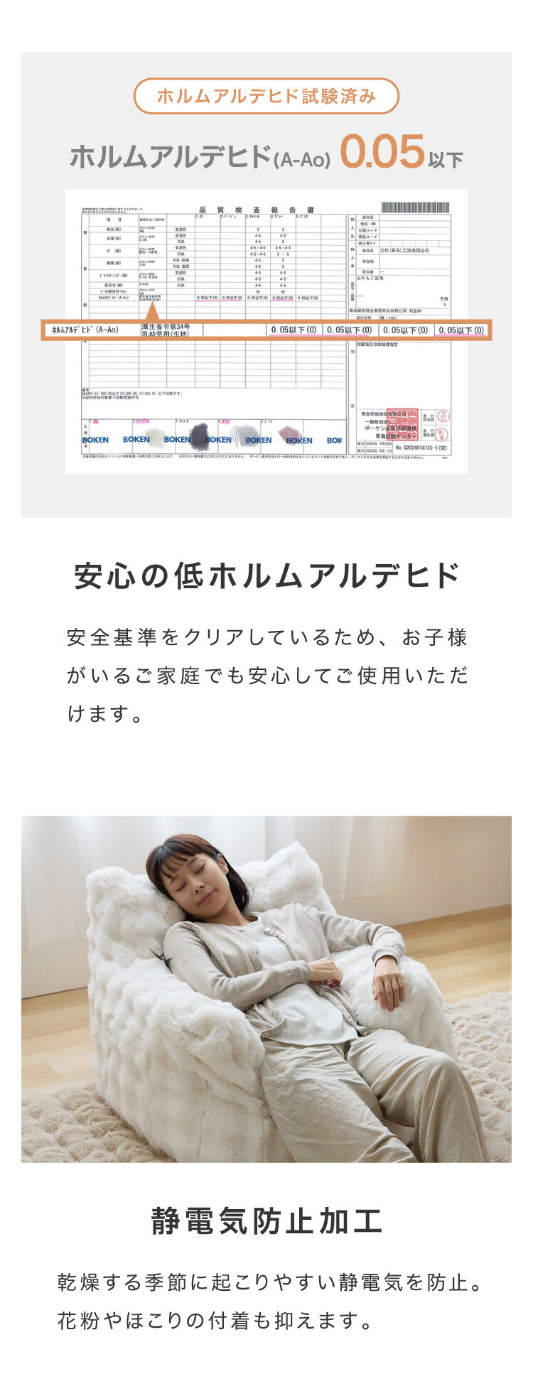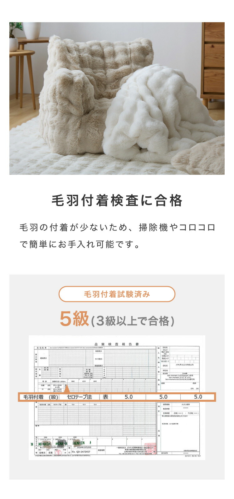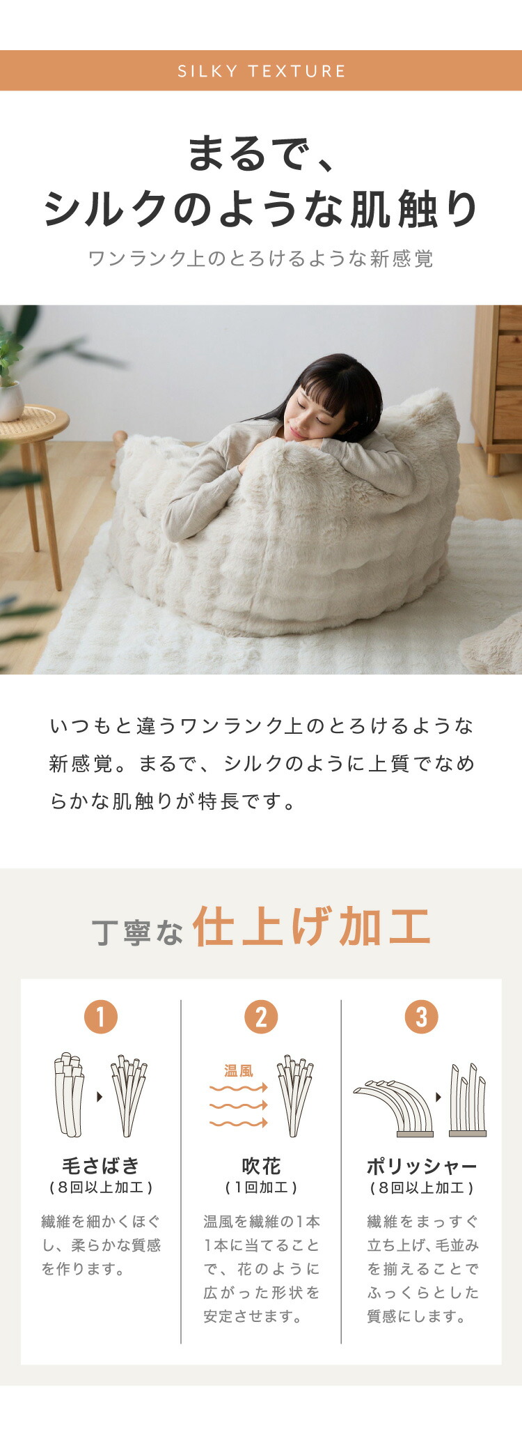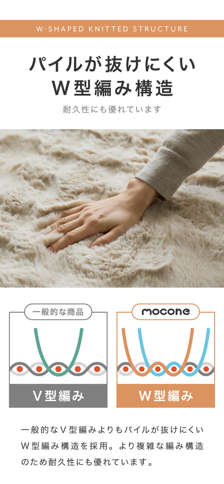 カバー上部には、もこもこ質感が心地よいポコポコラビット生地(480g/平方メートル)を使用。