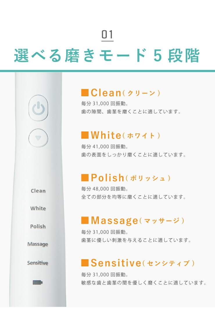 ・White:毎分41,000回の振動、歯の表面のステインを落とし、しっかり磨くことに適しています。