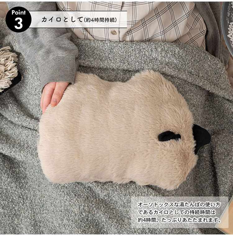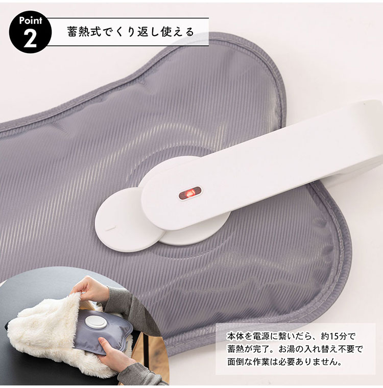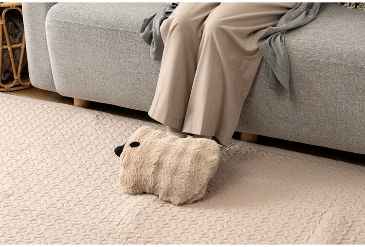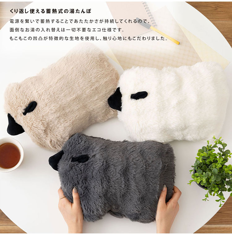 電源を繋いで蓄熱することであたたかさが持続してくれるので、 面倒なお湯の入れ替えは一切不要なエコ仕様です。 もこもこの凹凸が特徴的な生地を使用し、触り心地にもこだわりました。