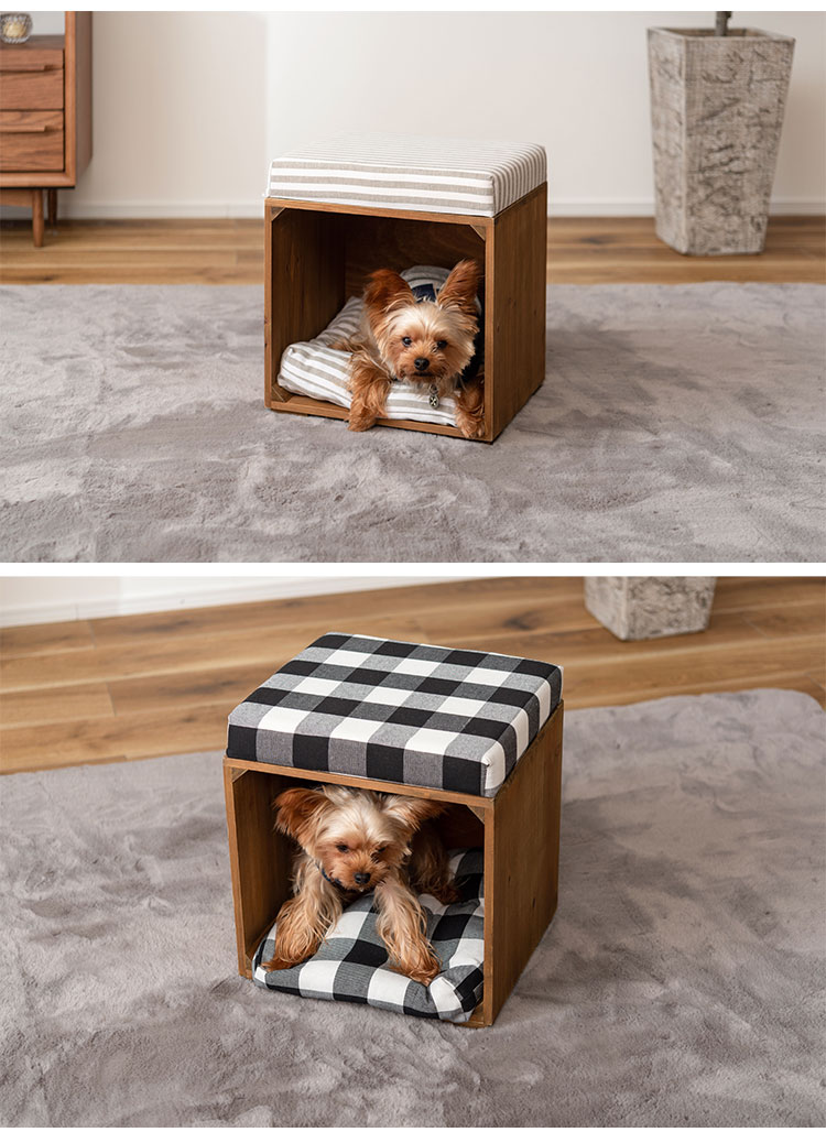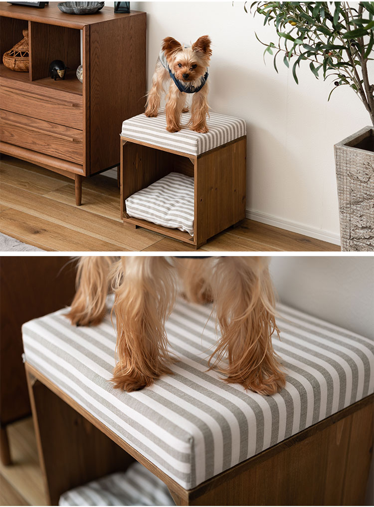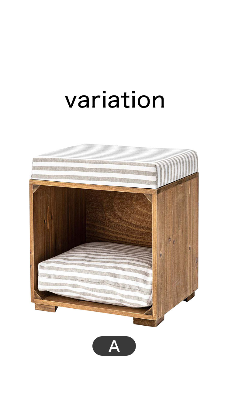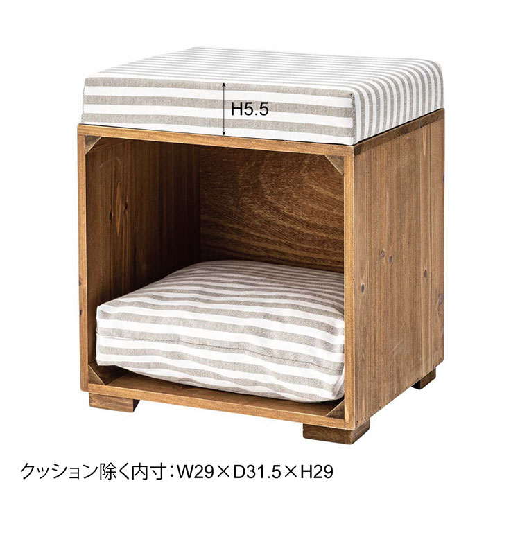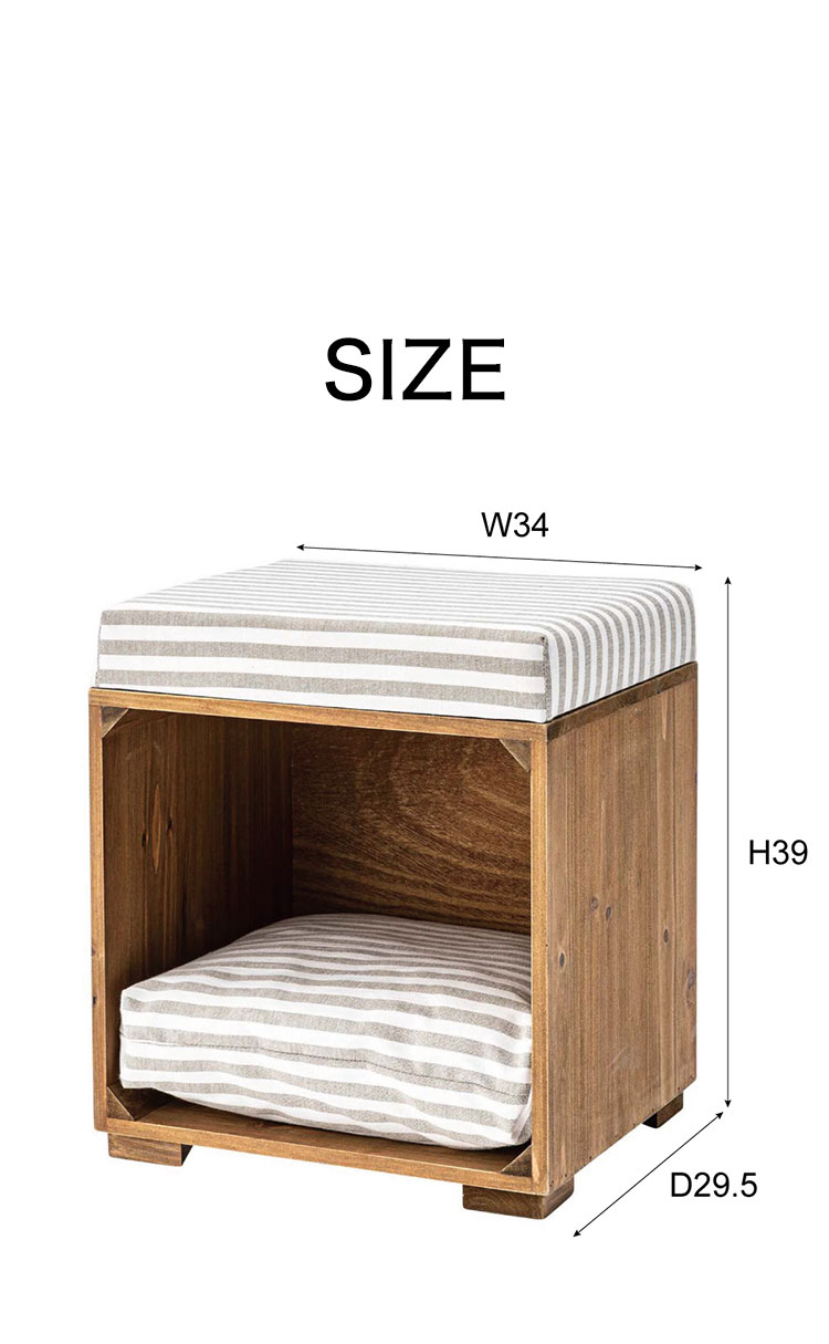 ●ペットが入れるボックス型のスツール。●ペット用クッションは取り外しが可能なので、クッションを外して収納ボックスとしても使えます(座面クッションは取り外しができません)。●ペット用クッションはカバーを外して手洗いができるので、いつでも清潔に使えます。●アンティーク感のある天然木(杉)フレームに、ナチュラルテイスト柄の生地を使用した、インテリア性の高いペットスツール。