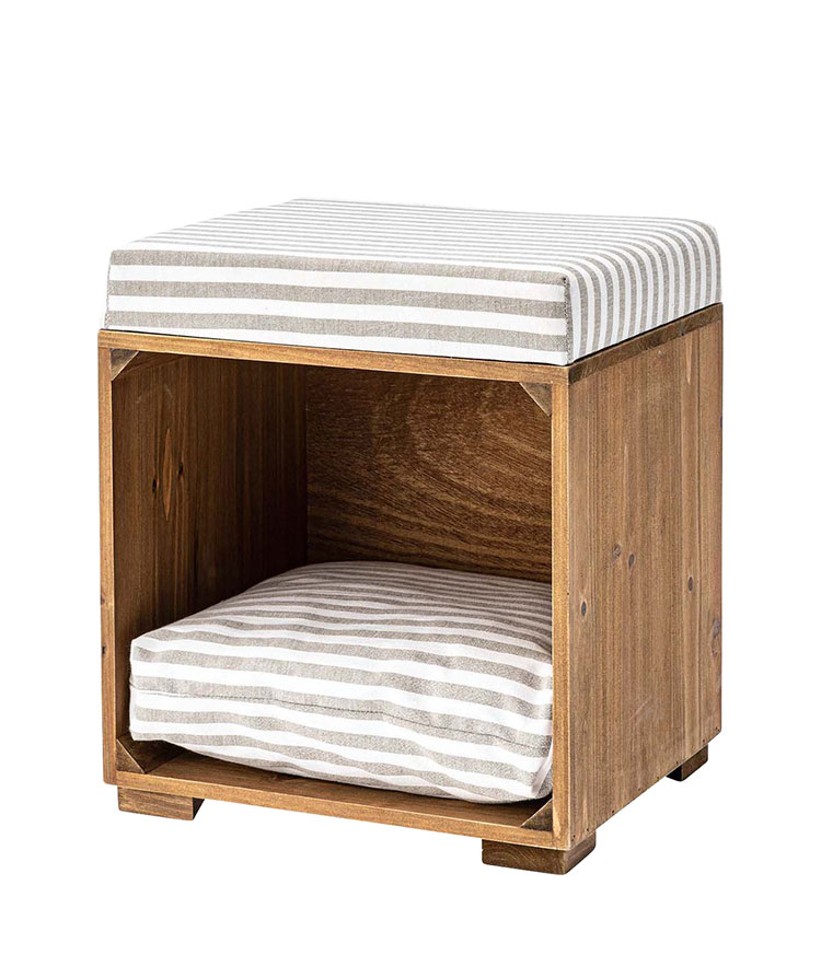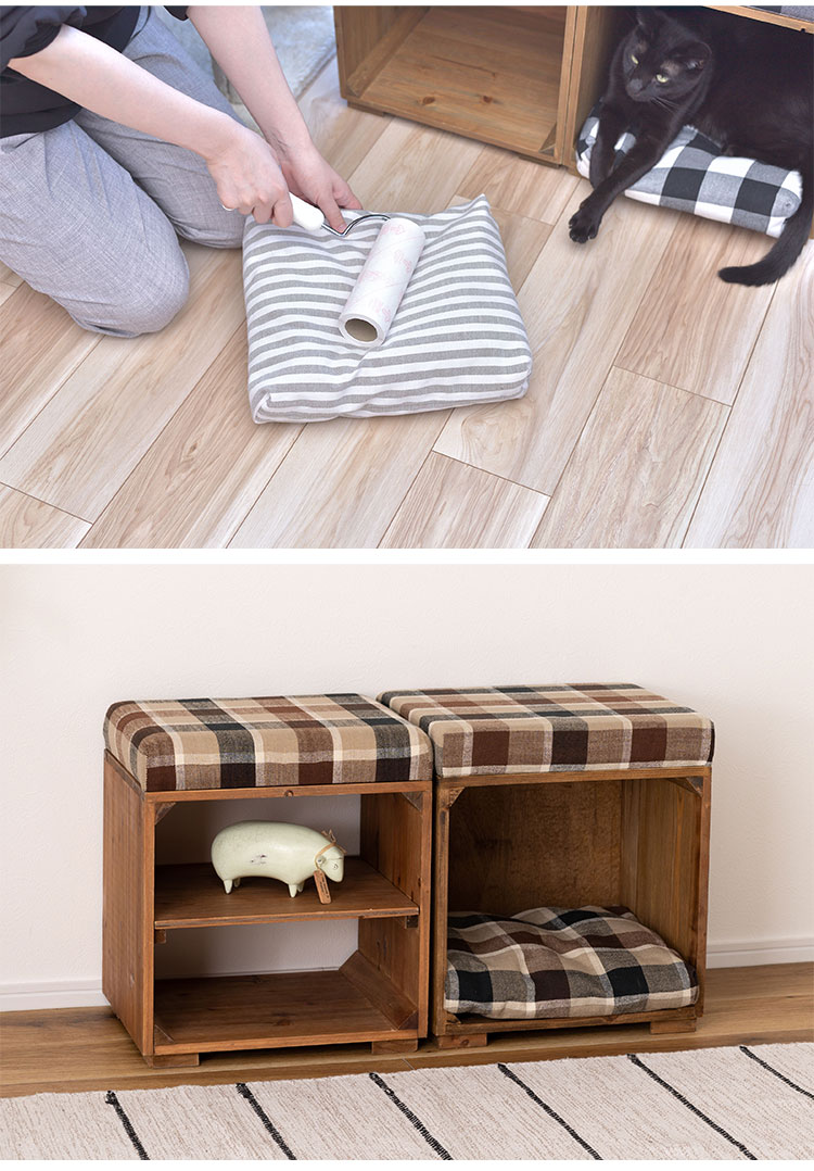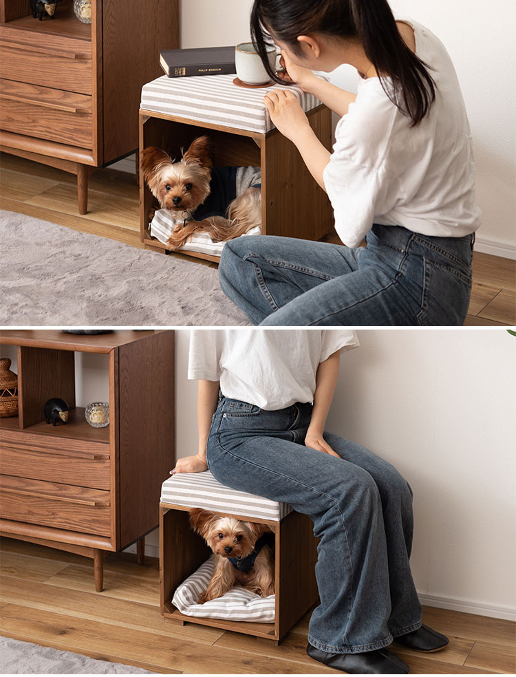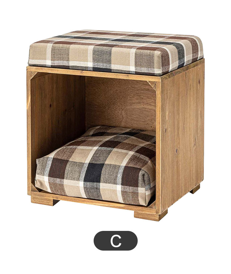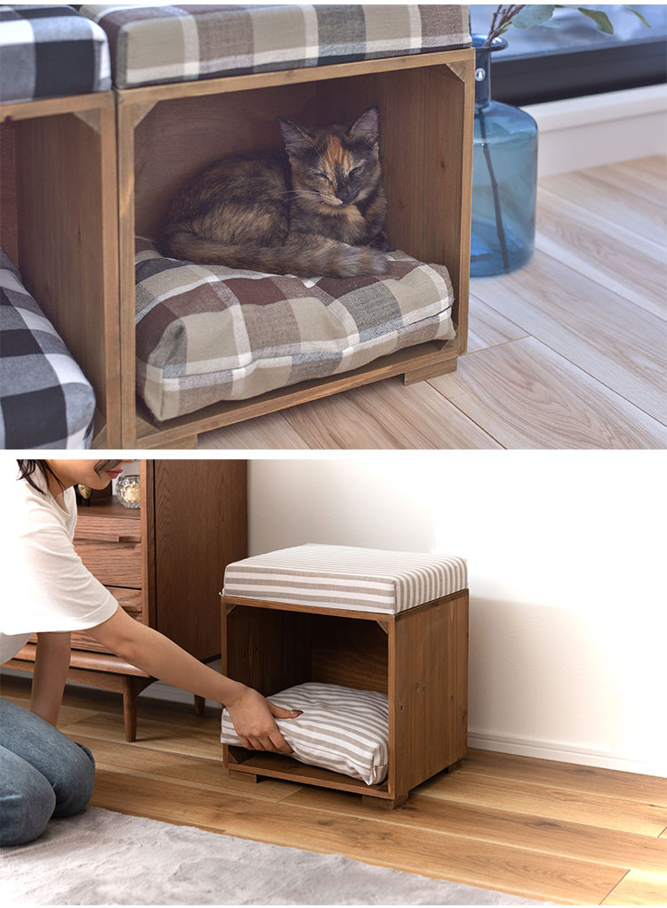 ●ペットが入れるボックス型のスツール。●ペット用クッションは取り外しが可能なので、クッションを外して収納ボックスとしても使えます(座面クッションは取り外しができません)。●ペット用クッションはカバーを外して手洗いができるので、いつでも清潔に使えます。●アンティーク感のある天然木(杉)フレームに、ナチュラルテイスト柄の生地を使用した、インテリア性の高いペットスツール。