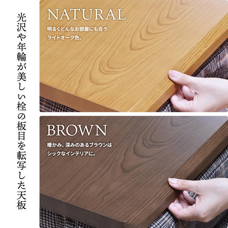 シンプルで落ち着きのある「栓(セン)」柄シートを使用し、シンプルで飽きの来ないデザインのハイコタツ兼ダイニングテーブルです。どこか懐かしく落ち着いた木目と、色は「ブラウン」と「ナチュラル」の2色展開で、両方ともシンプルで落ち着いた色なので、お部屋にマッチしやすいです。ヒーター部分は安心な日本メーカーのメトロ電気工業の製品が使用されており、手元で温度調節ができるコントローラー付いていて便利です。ハイタイプのコタツなので、布団を外せばコタツを使わない季節でも普通のダイニングテーブルとしても使えるので、一年通して使えるコタツ兼ダイニングテーブルとして人気です。天板塗装には耐久性の高いUV塗装を施しているので、高品質なので長くお使い頂けます。こたつはエアコンと比較すると、約3分1の電気代で済むと言われており昨今の高騰する電気代の節約にも優れています。