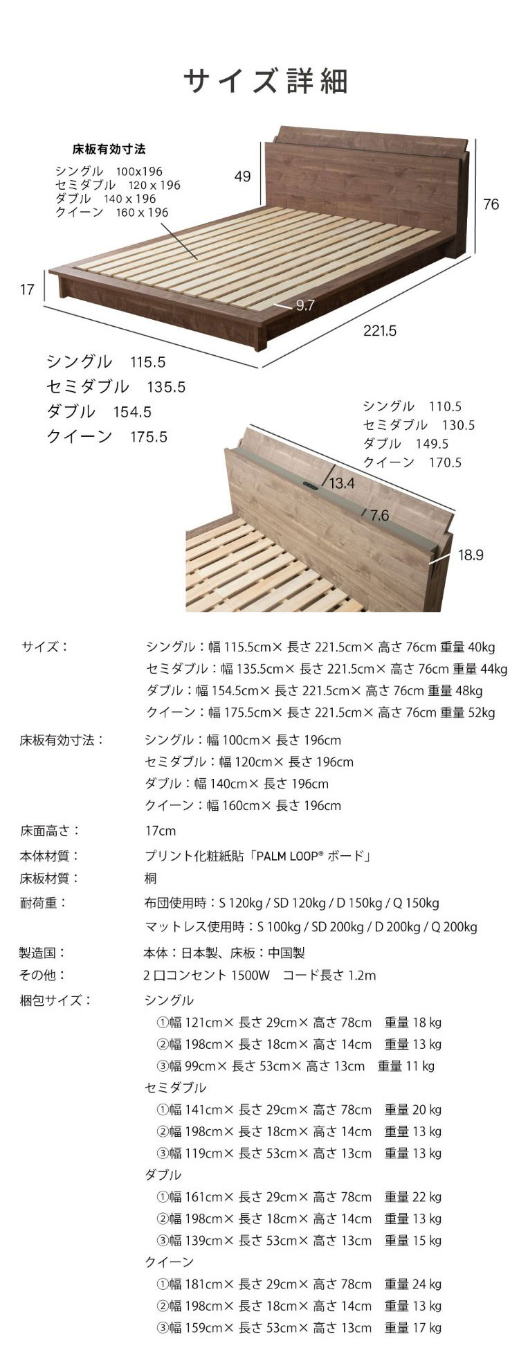 ダブル/パームウォールナットブラウン | ダブル/パームウォールナットグレー | クイーン/パームウォールナットブラウン | クイーン/パームウォールナットグレー |