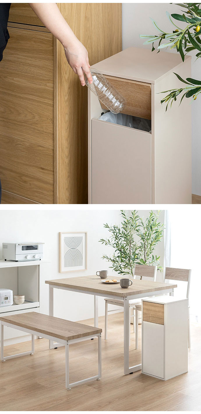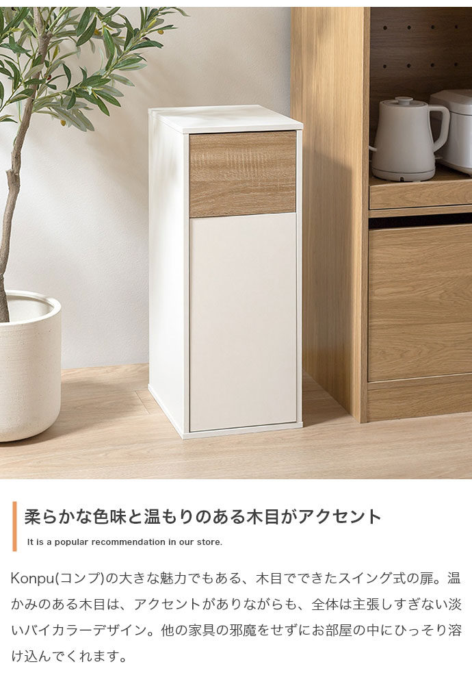 北欧やナチュラルなど幅広いテイストに合わせやすい『Konpu(コンプ)』のゴミ箱。優しい色合いで温かみのある木目がアクセントのおしゃれなデザインです。捨て口は蓋ではなく、スイング式の扉に。片手でサッとスムーズに捨てることができます。また捨て口の広さも、ペットボトルなどの大きいゴミが捨てられるようにサイズ感にこだわりました。本体はしっかりとした容量がありながらも、スリム設計のため、お家の隙間に置くこともでき場所をとりません。