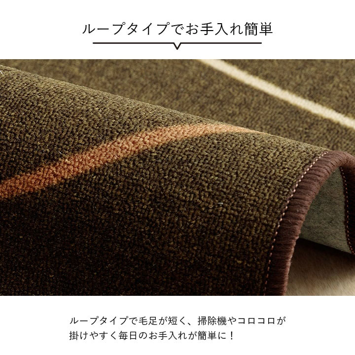 表面はループタイプで毛足が短いので、ゴミもたまりにくくお手入れも簡単。またポリプロピレン糸を使用しているから摩擦に強く、毛玉が出にくいのも特徴です。