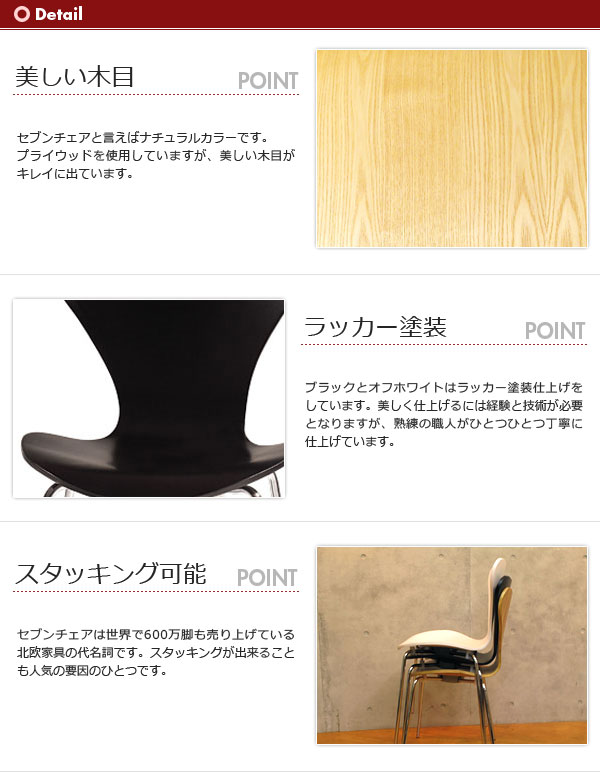 1955年にアントチェアのバリエーションとして発表されたアルネ・ヤコブセンの代表作です。座面は薄い7枚の板と2枚の仕上げ板を合同加工すると同時に椅子の形に形成するという高度な技術が、手入れが簡単で軽くて扱いやすく、耐久性に優れたチェアを生み出しました。積み重ねることが可能な「スタッキング」機能が付いていますので、使わない時などは場所を取らずに片付けられます。