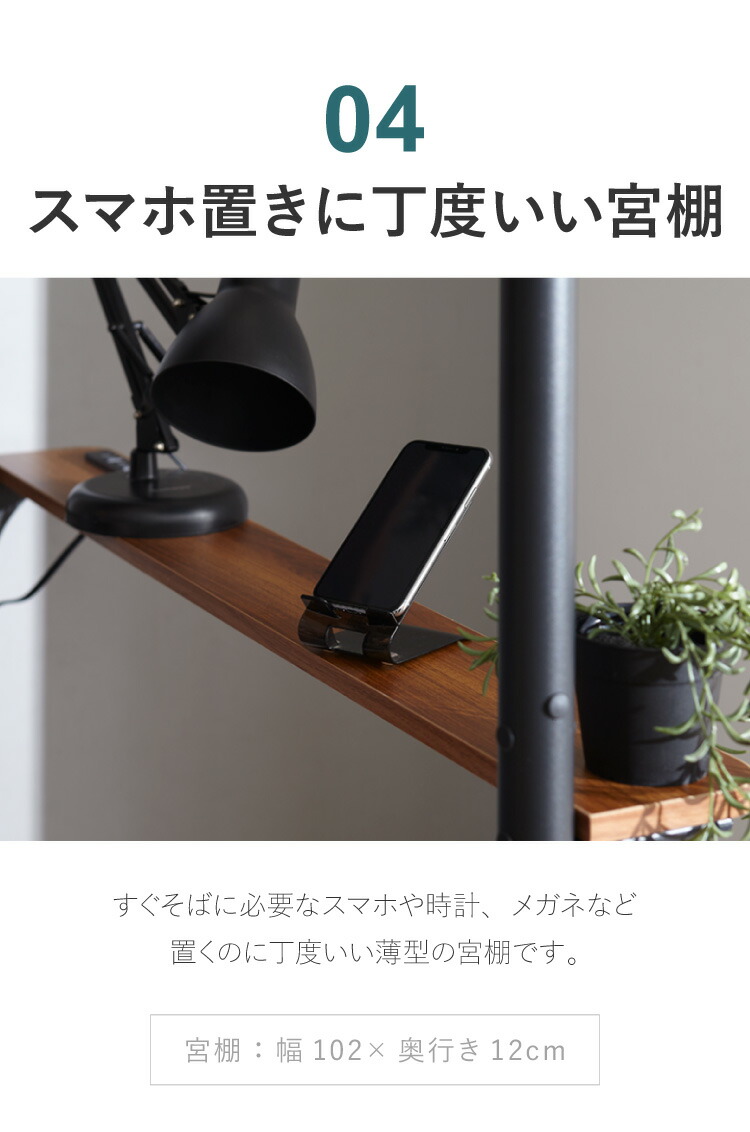■詳細:上部棚サイズ:幅206×奥行き30cm(落下防止金具付) L型デスク:幅102(12)×奥行き35(100)cm(3段階の高さ調節) ハンガーパイプ2本、メッシュ網棚、2口コンセント付宮棚