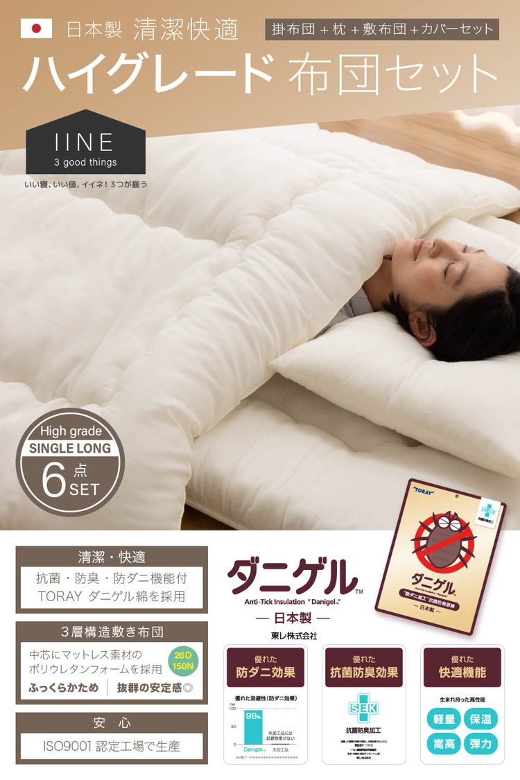 布団6点セット 掛け布団 敷布団 枕 カバー付き シングル 日本製 ハイグレード 洗える 和 清潔快適 ダニゲル 抗菌 防臭 防ダニ 寝具 ふとん 硬め 体圧分散 耐久性 ウレタンフォーム シンプル(代引不可)