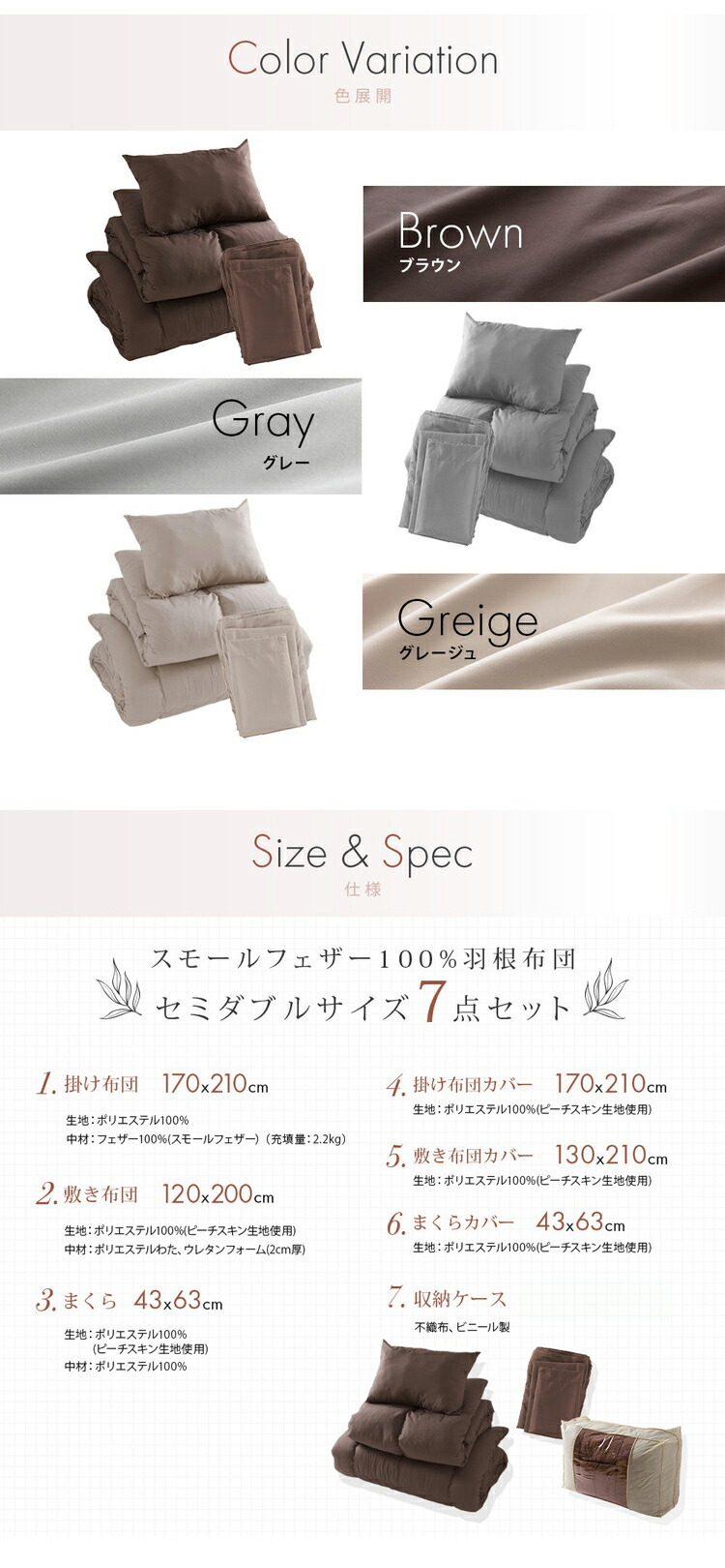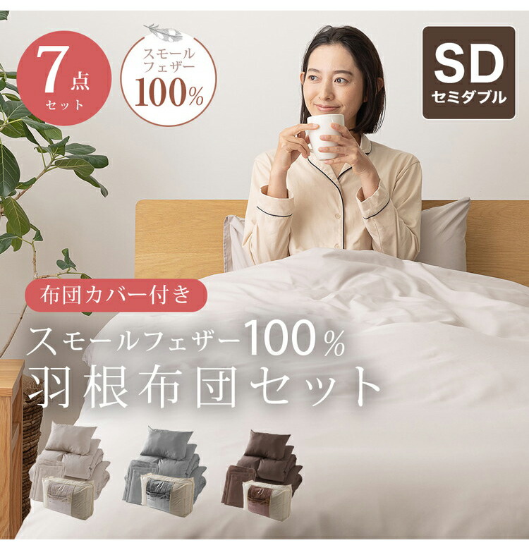 布団セット セミダブル 7点 増量2.2kg スモールフェザー羽根布団 無地 掛布団 敷布団 枕 収納袋 カバー付き ピーチスキン加工 ふんわり 寝具セット 寝具 新生活 一人暮らし おしゃれ(代引不可)