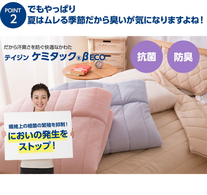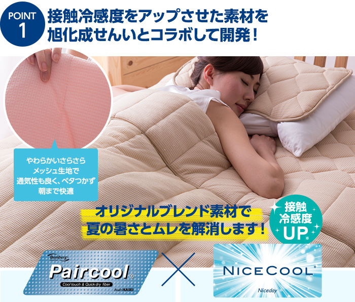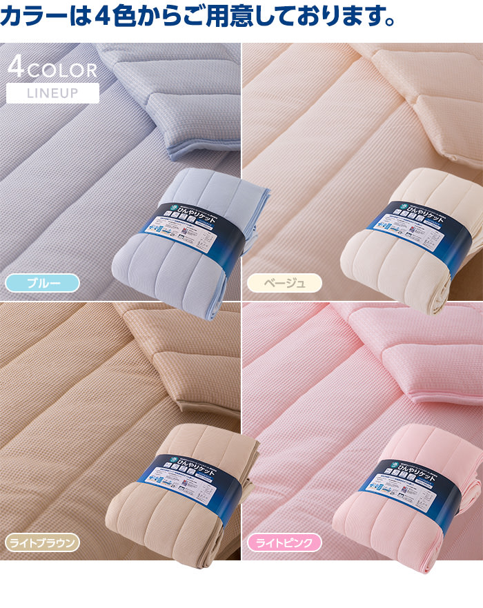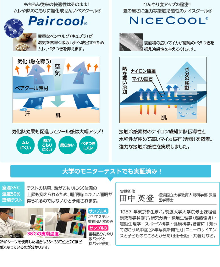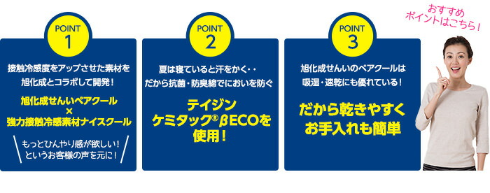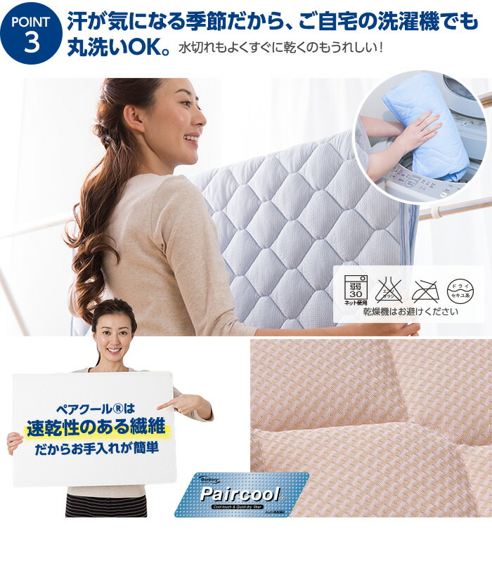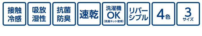 | その他 | ・洗濯ネットを使用の上、30度以下の液温で洗濯機の弱水流または弱い手洗いで洗って下さい。 ・塩素系漂白剤は脱色変色をきたすことがありますので絶対に使用しないでください。 ■素材提供 旭化成せんいPaircool(R)素材:旭化成せんい株式会社 帝人ケミタック(R)βECO綿:帝人株式会社 |