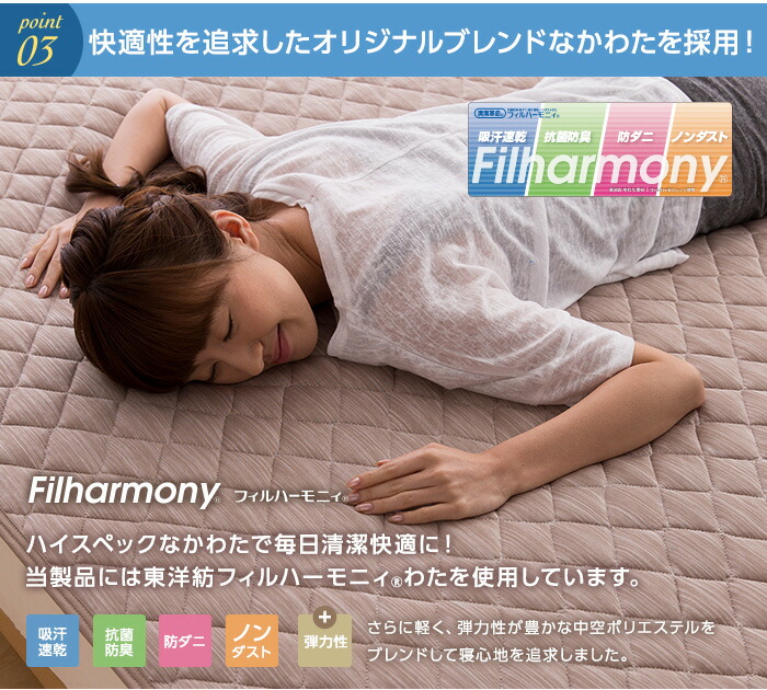 中綿:ポリエステル100%(アウトラスト(R)わた50%、東洋紡フィルハーモニィ(R)わた30%、中空わた20%使用)