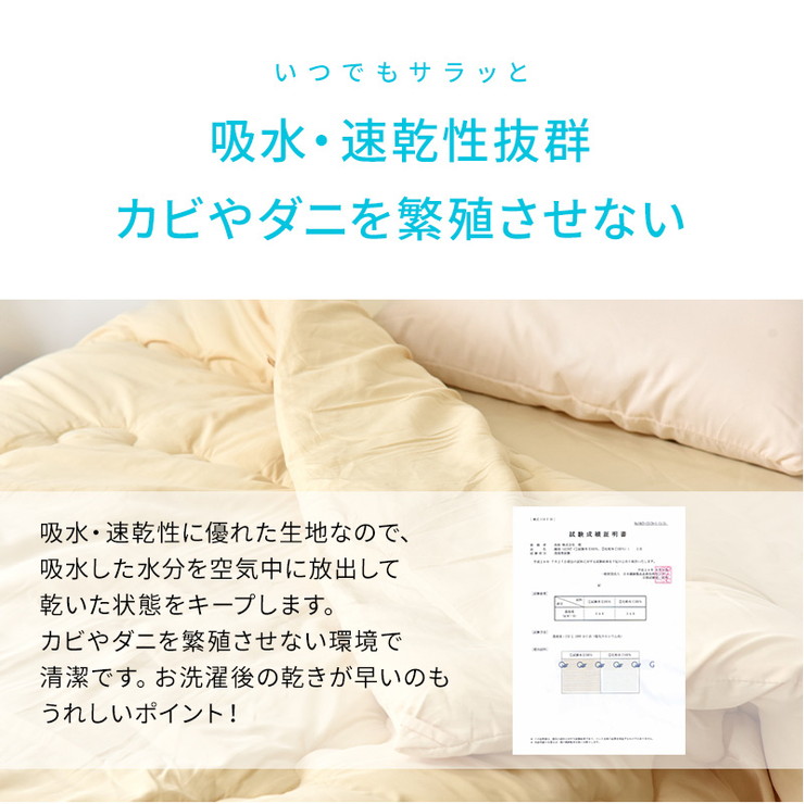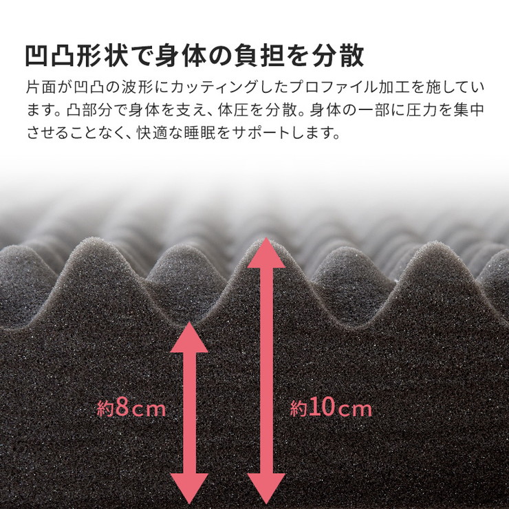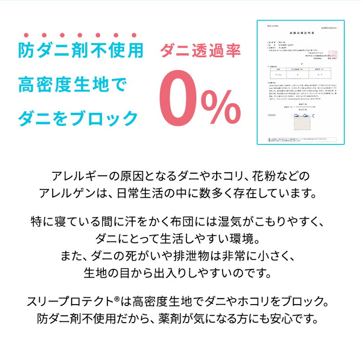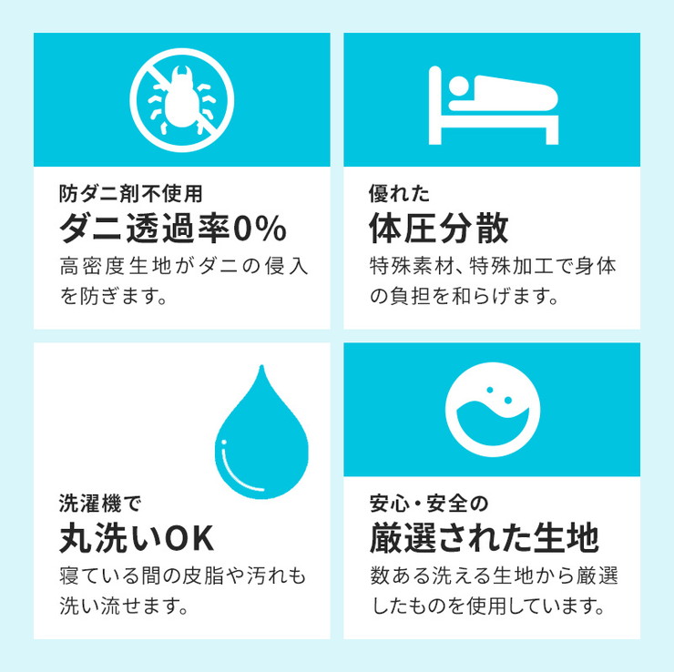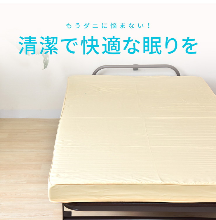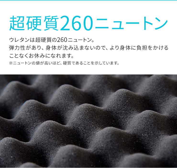 生地はダニを通さない高密度生地を使用し、中材に超硬質(262ニュートン)ウレタンで仕上げておりますので、清潔・快適な眠りをお届けいたします。