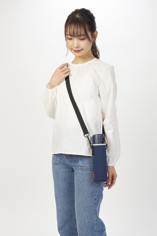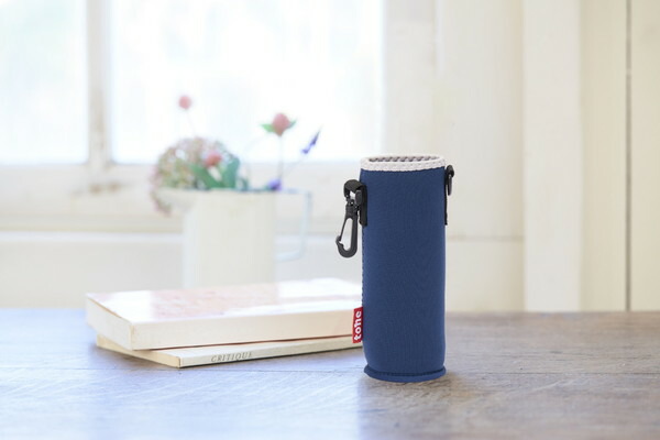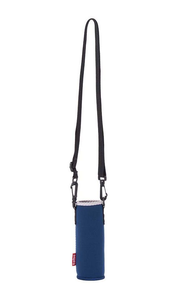 底面がフラットでカバーだけでも倒れないボトルカバー。ショルダーストラップ付き。