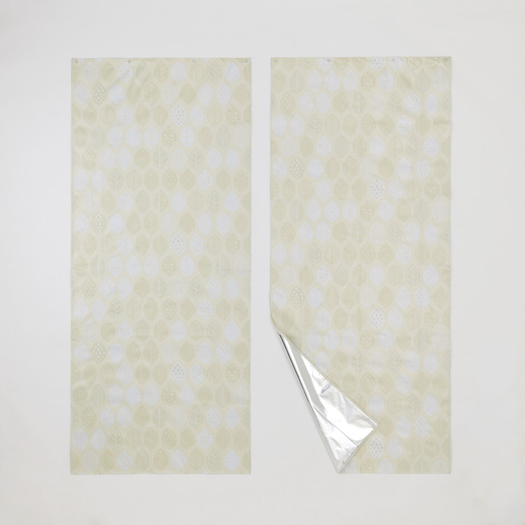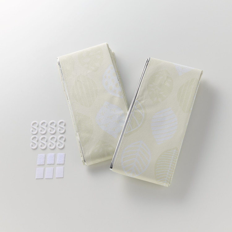 窓からの太陽光や冷気を遮断することで、冷暖房効率をアップさせる遮光スクリーン。遮光率約98%、UVカット率約94%。真夏の直射日光や強い西日もしっかり防ぐ。内側は白地にカジュアルなリーフ柄。