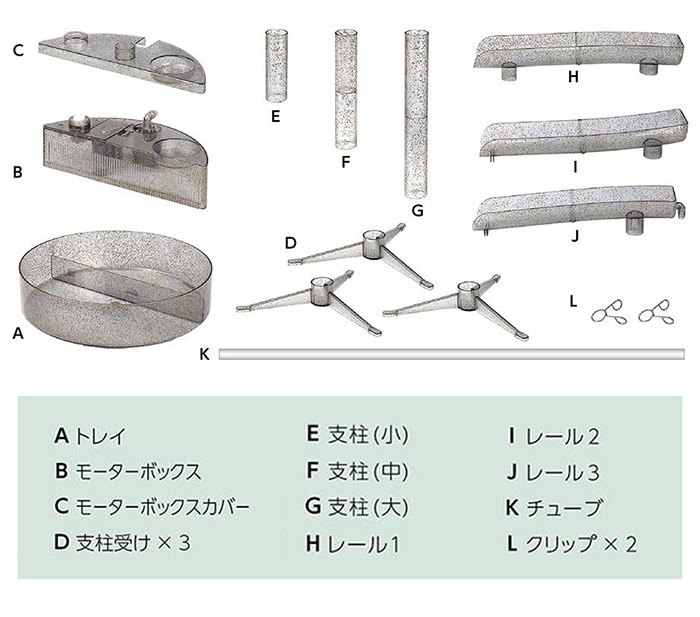 ・セット内容:トレイ、モーターボックス、モーターボックスカバー、支柱受け×3、支柱(小)、支柱(中)、支柱(大)、レール1、レール2、レール3、チューブ、クリップ×2