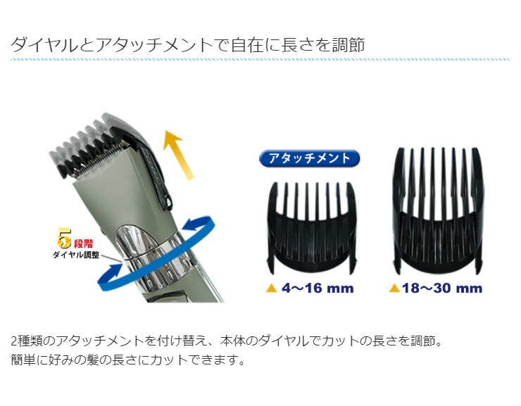 2種類のアタッチメントを付け替え、本体のダイヤルでカットの長さを調節。