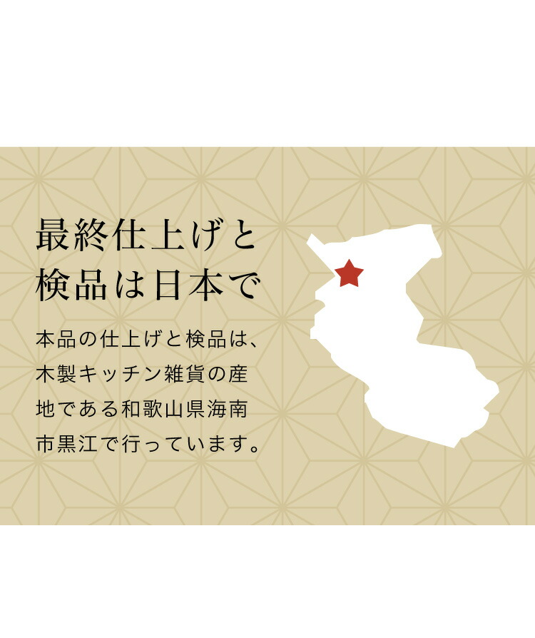 木製キッチン雑貨の一大産地「和歌山県海南市黒江」で製品の仕上を行い、検品された商品をお届けいたします。