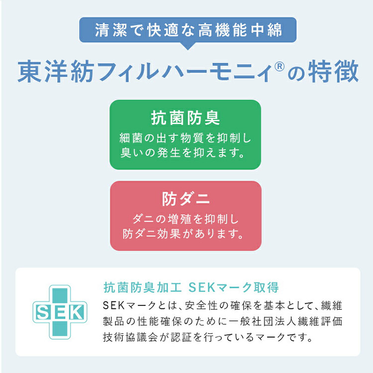敷布団の中綿は東洋紡フィルハーモニーを使用しています。