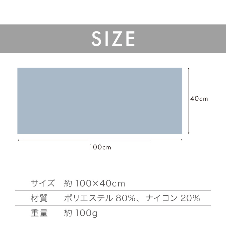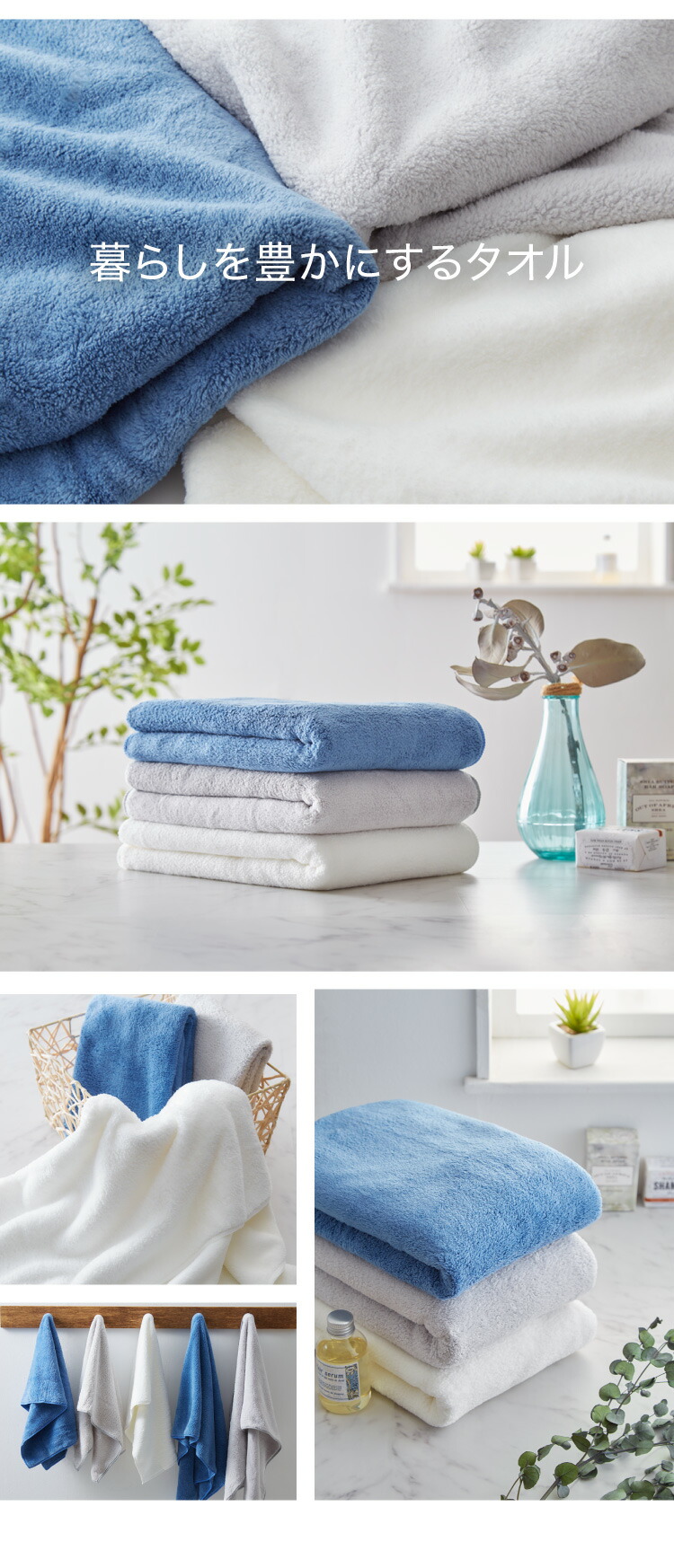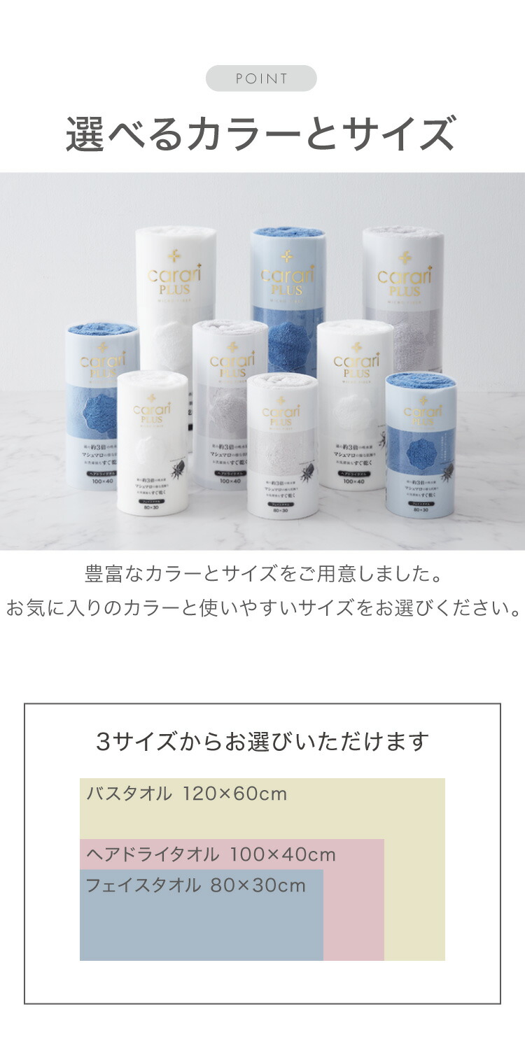 フェイスタオル 80×30cm | ヘアドライタオル 100×40cm | バスタオル 120×60cm |