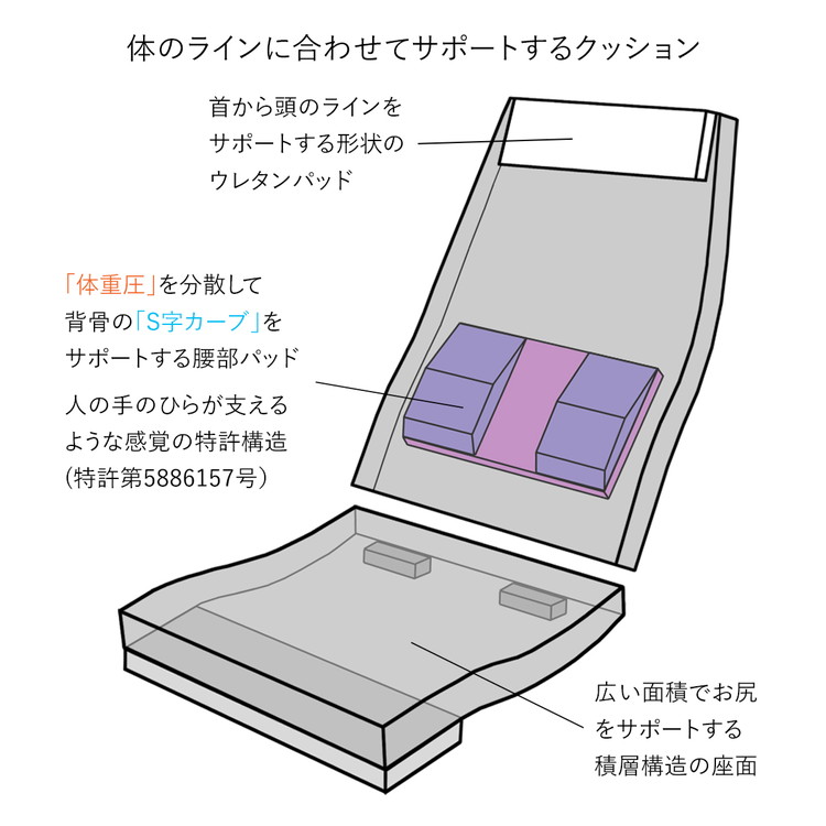 背もたれは人の手のひらが背中を支える感覚で「体重圧」を分散、背骨の「S字カーブ」をサポートする構造。(特許第5886157号)