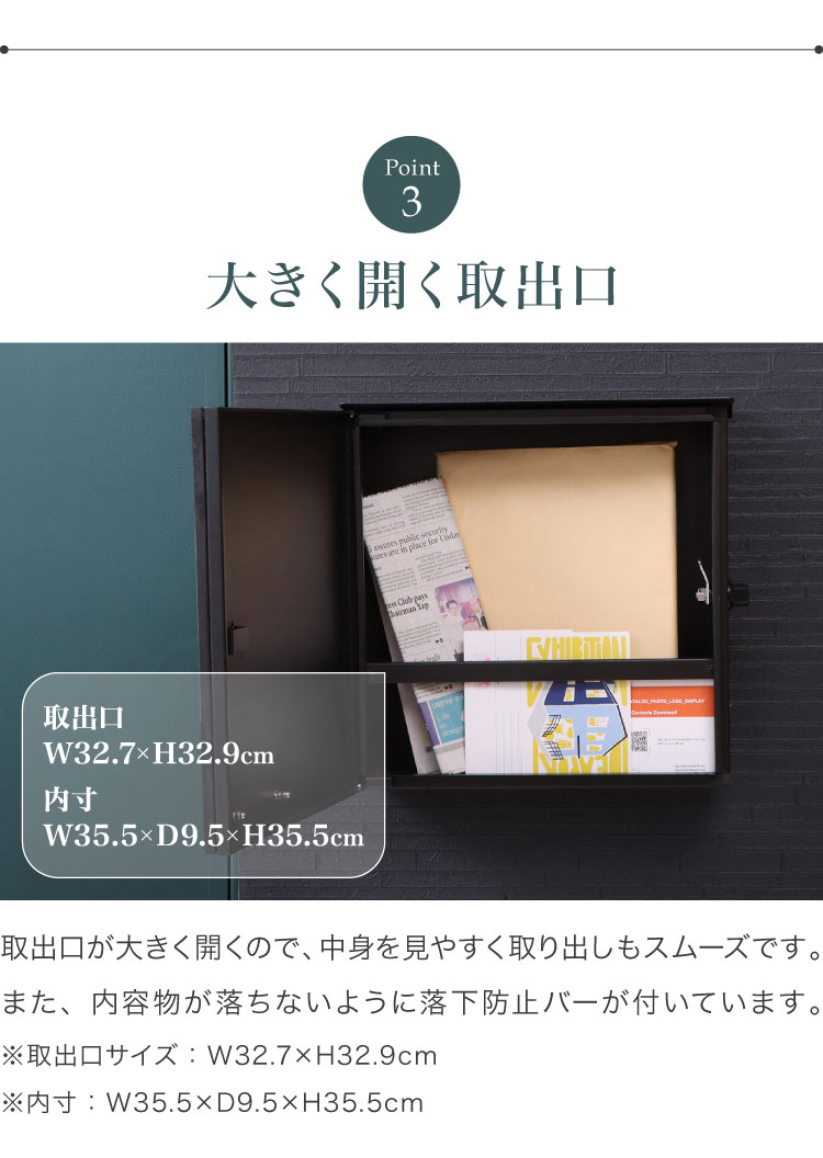 取り出し口には簡易施錠も可能な鍵付きのひねり錠がついているので防犯面も安心です。
